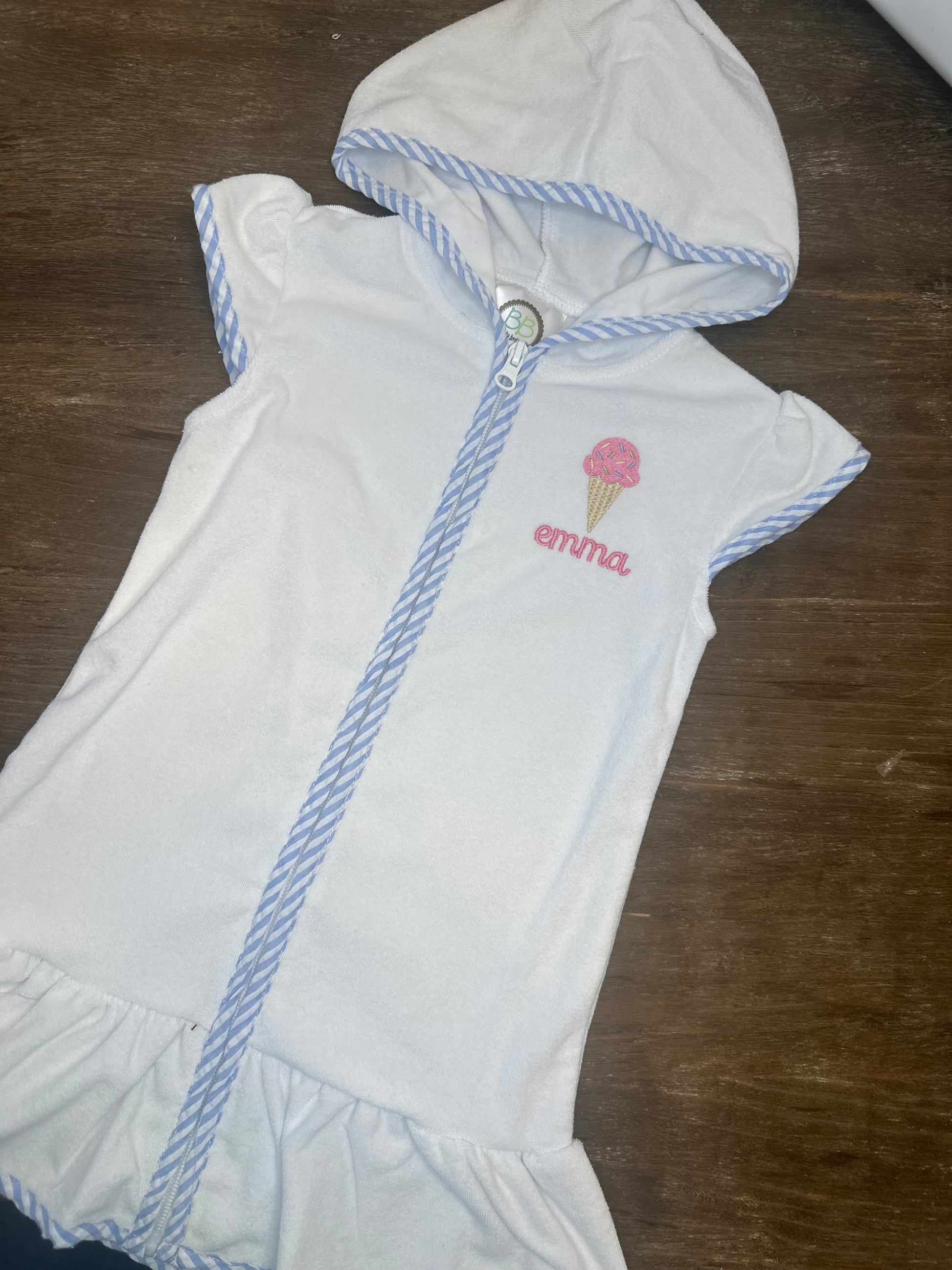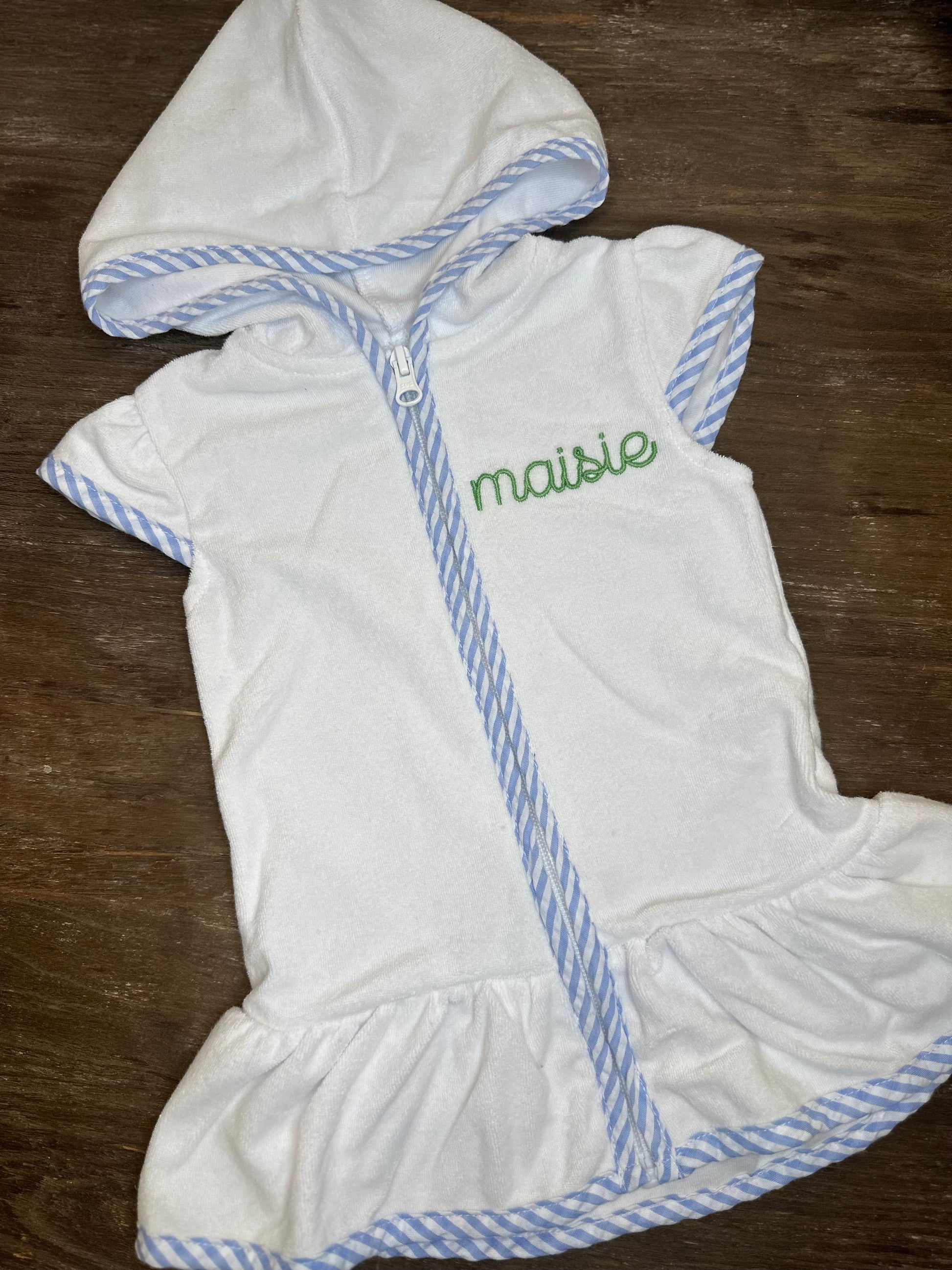 This soft, terry cloth coverup with full zipper and hood will be perfect for those beach and pool days! Just add a monogram, name, or motif!