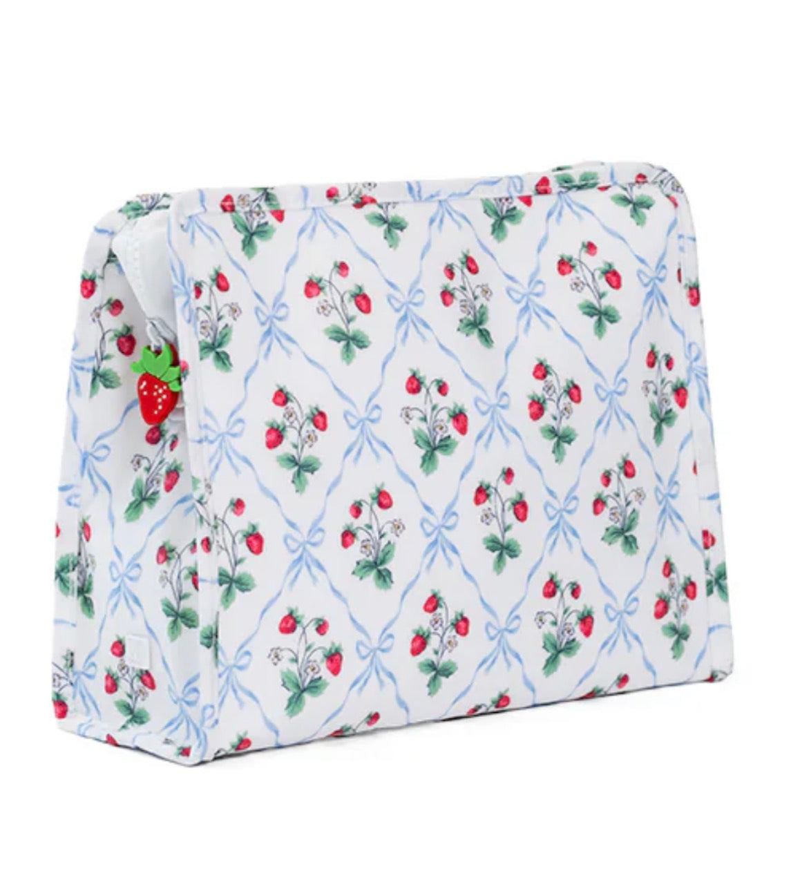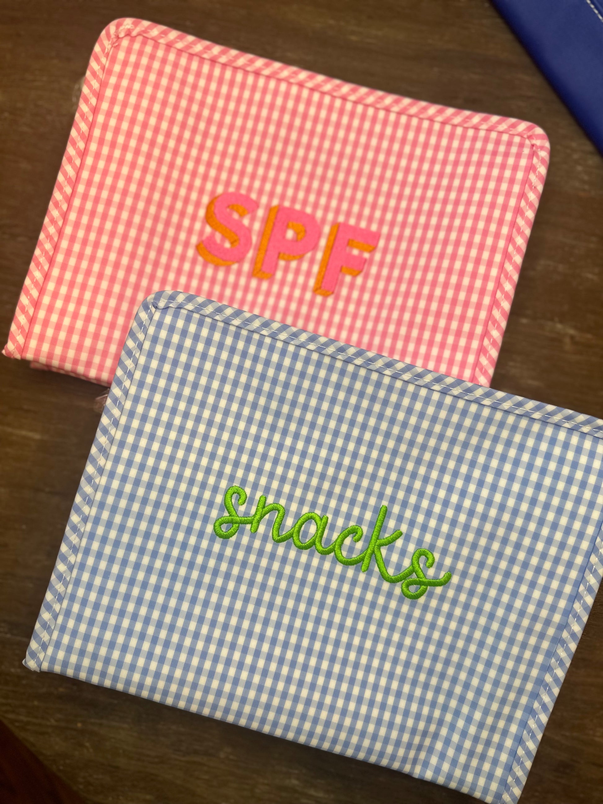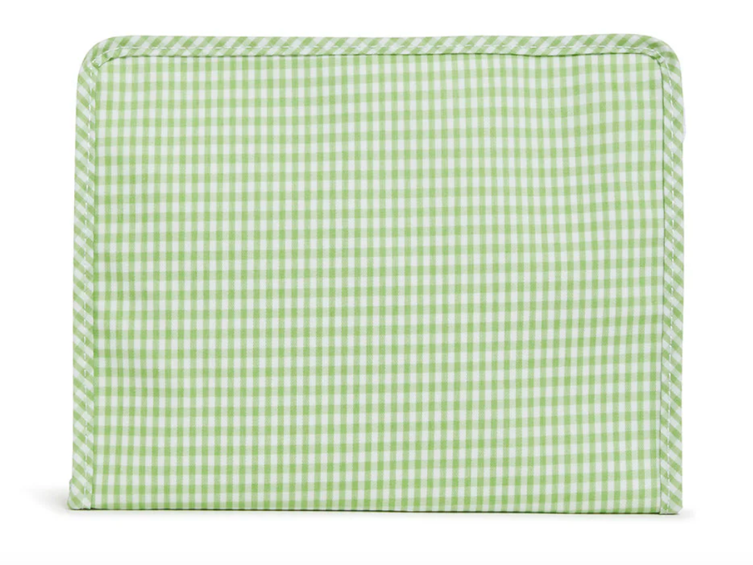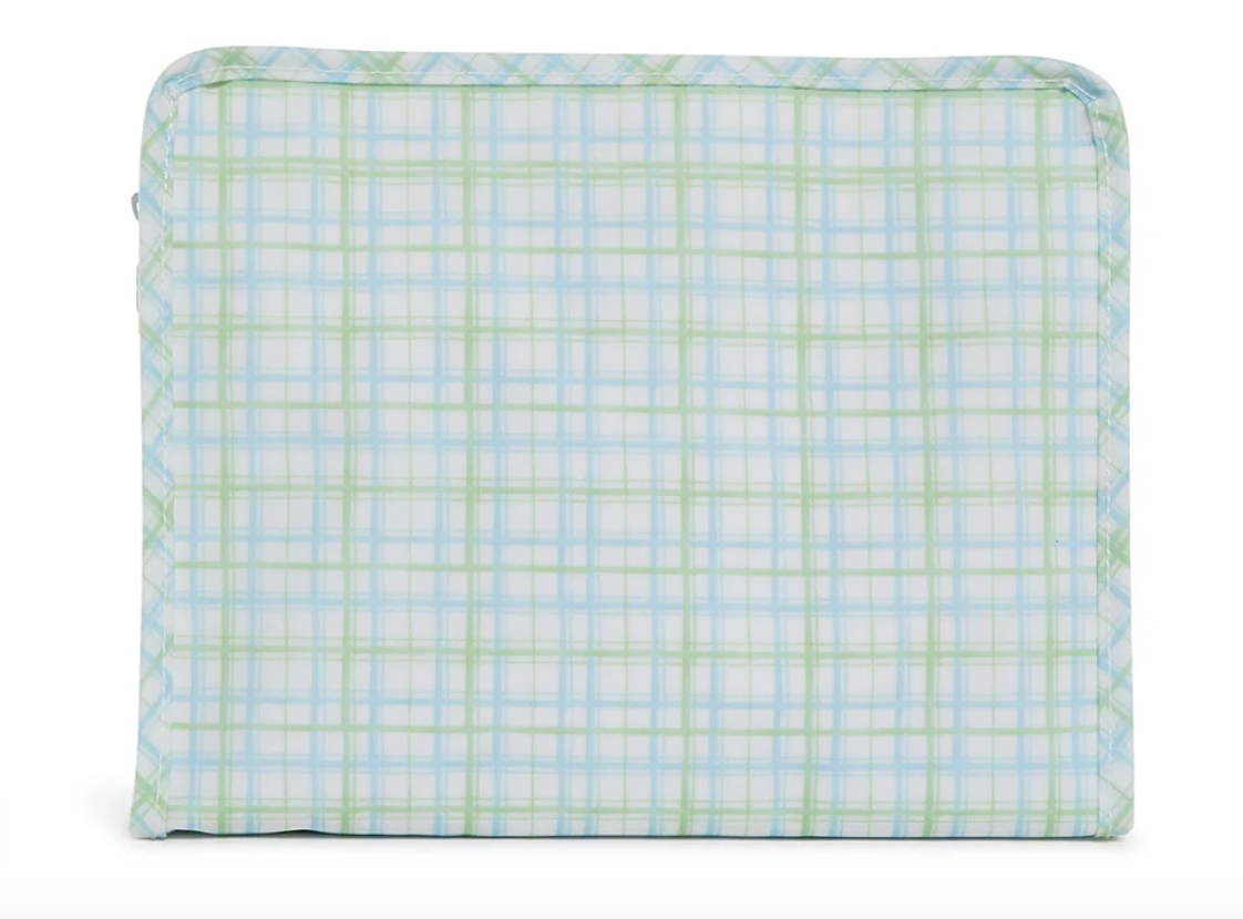 Roadies are our BFFs in the pouch world! The Large Roadie is made in a cotton gingham with a thin Eco-friendly matte coating, an inside slip pocket and exterior snap open zip tabs for a wider opening and an easier access.
